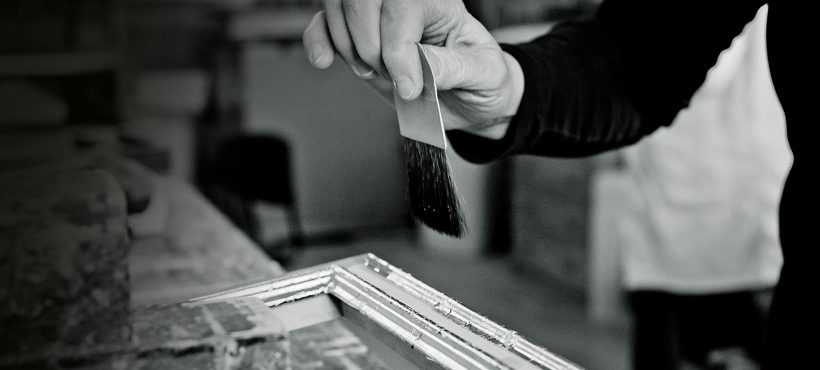und stilgerechter Gestaltung der Oberfläche an. Dazu gehören Poliment- und Ölvergoldung in Echtgold, Silber, Weißgold und Platin. Diese Techniken können neben Rahmen auch auf Möbel und Figuren angewendet werden.